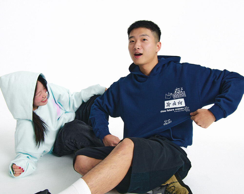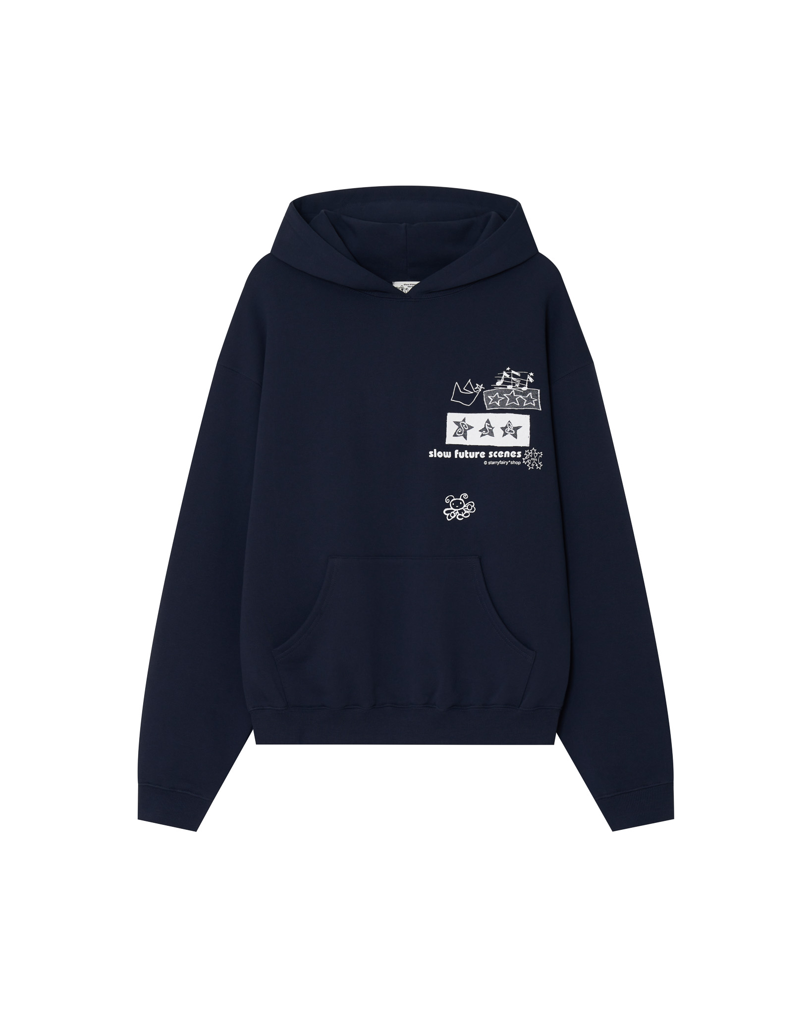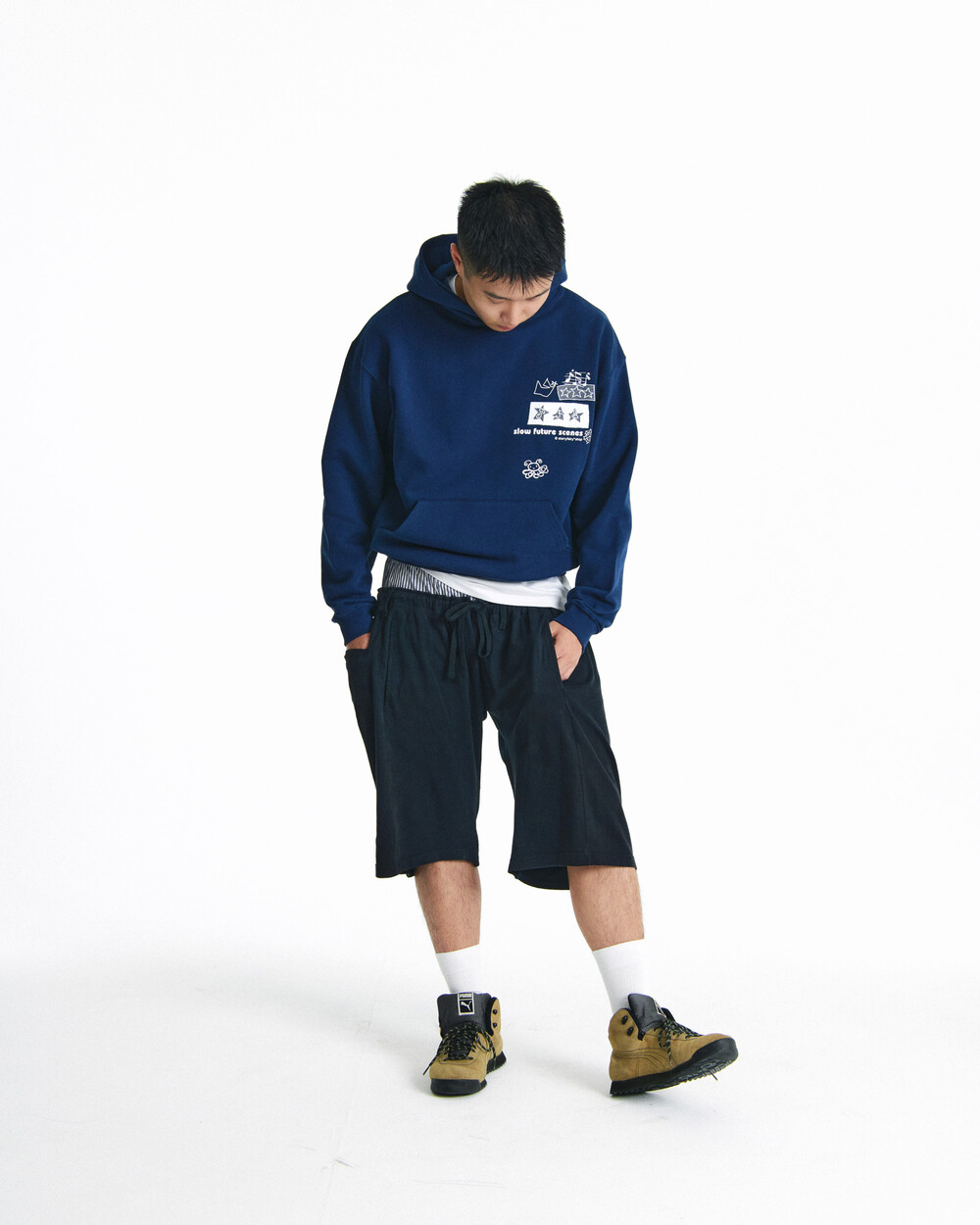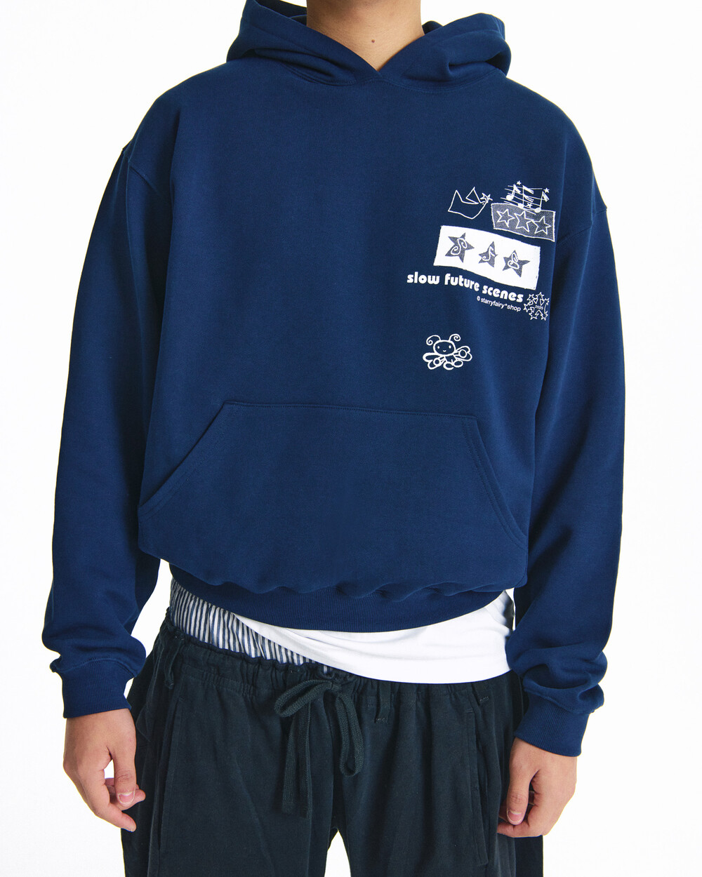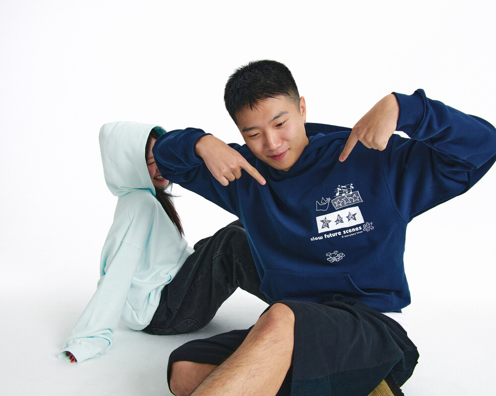Midweight cotton fabric without brushed lining Soft yet firm texture suitable for multiple seasons Silkscreen printed from collected memories and moments Kangaroo pocket with ribbed cuffs and hem