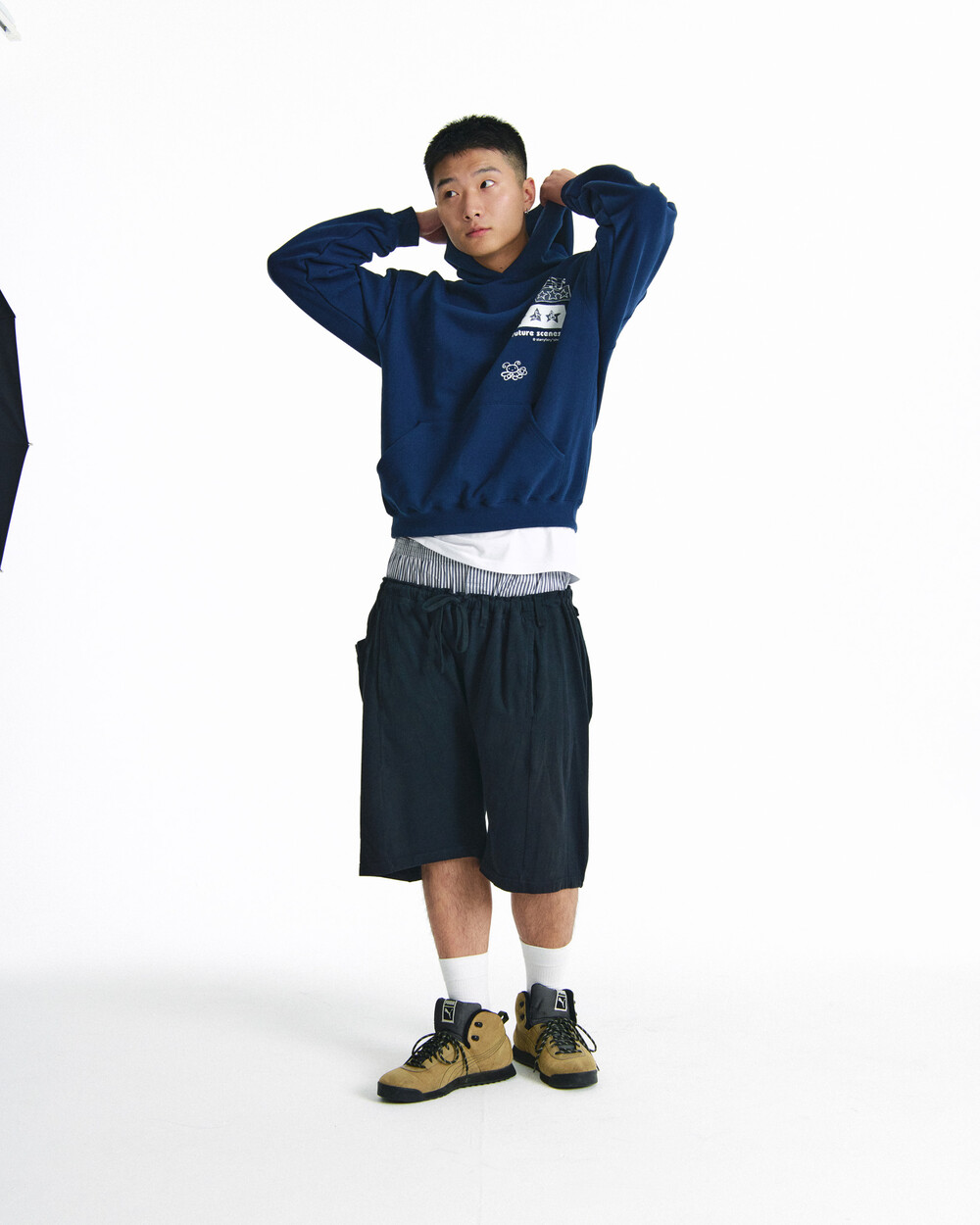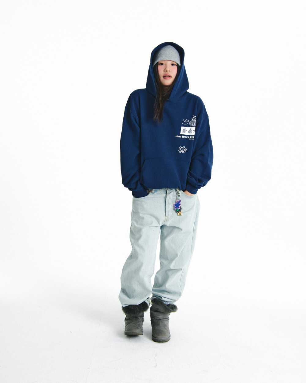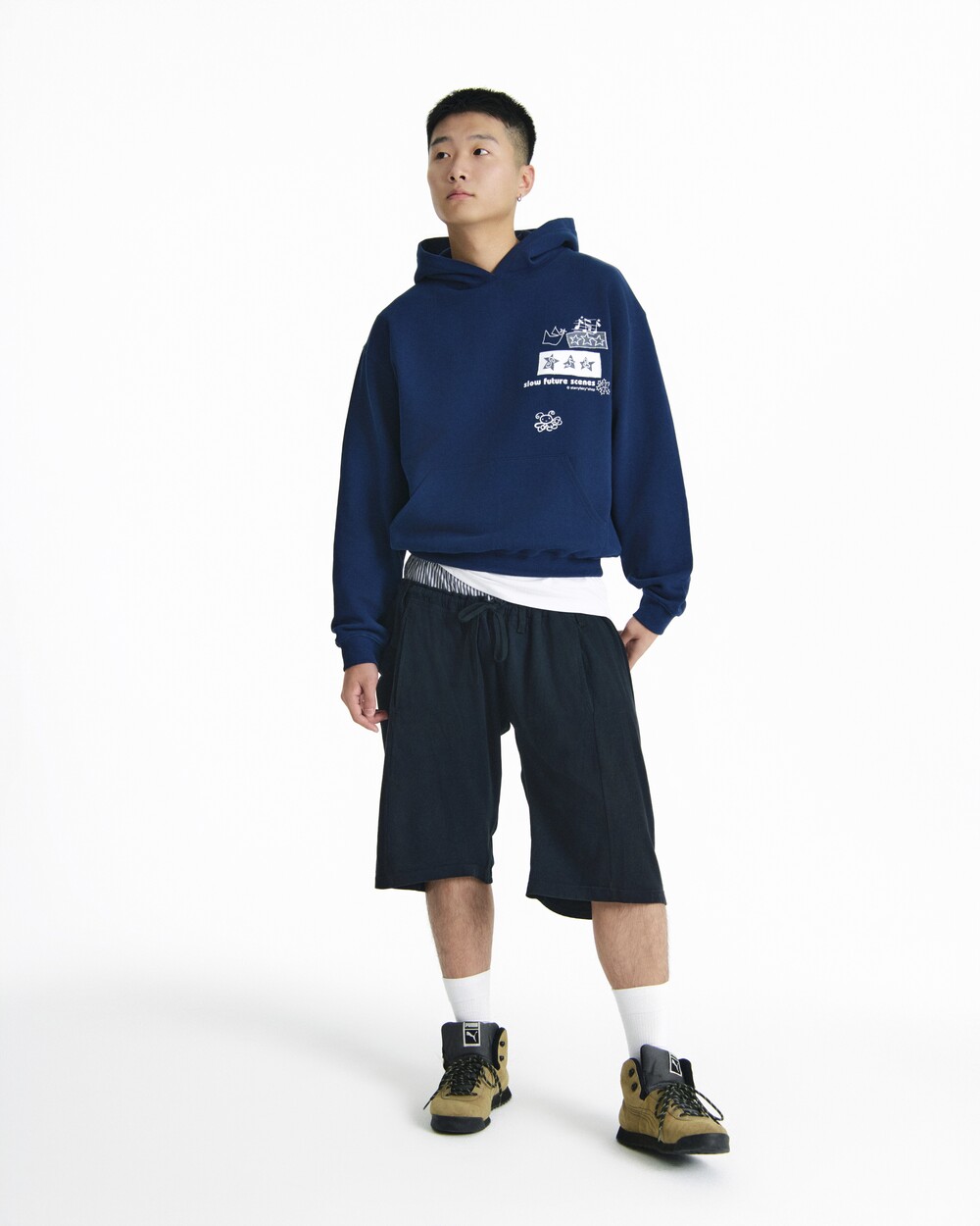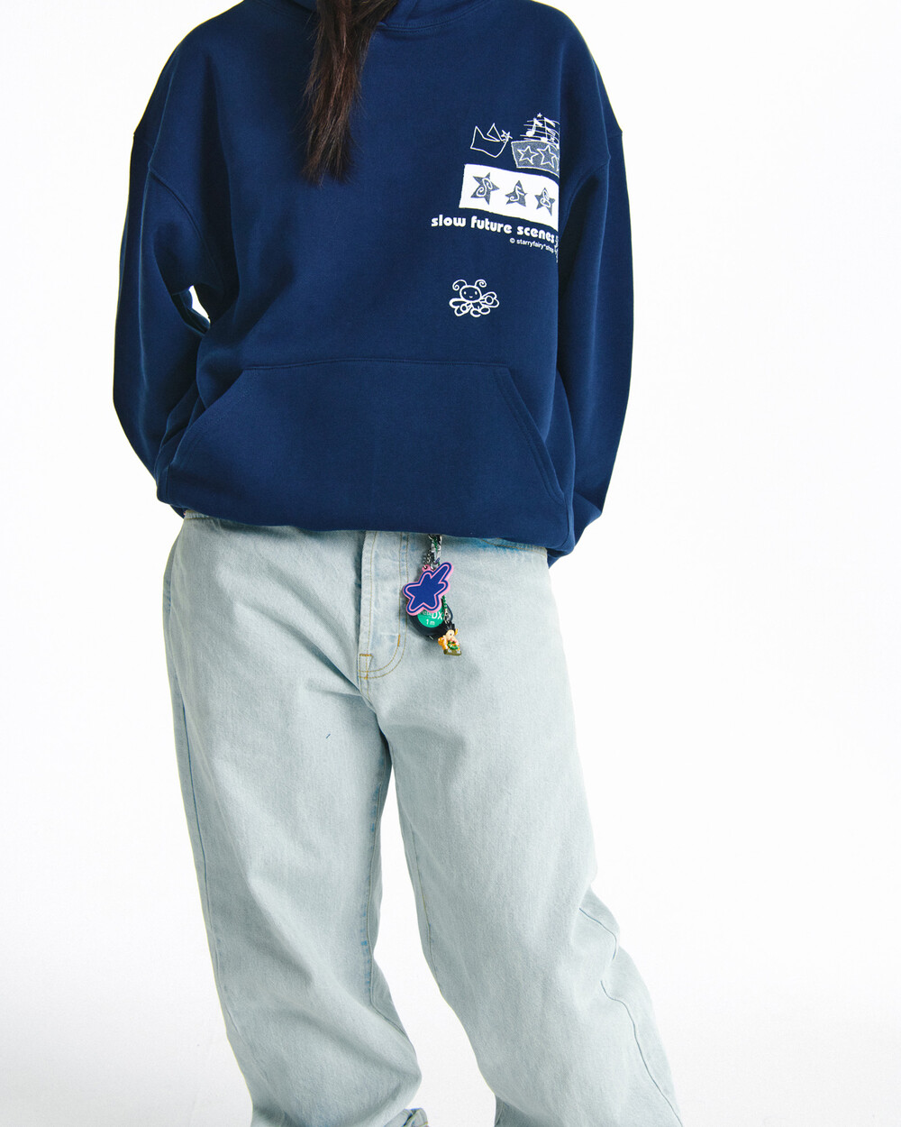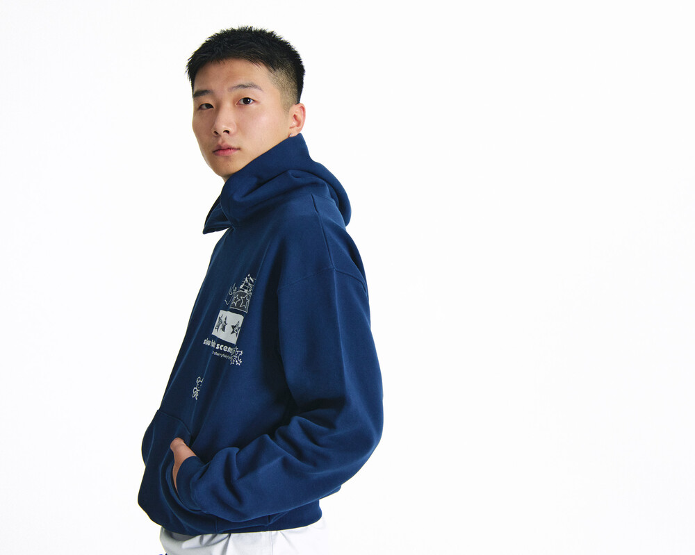 Midweight cotton fabric without brushed lining Soft yet firm texture suitable for multiple seasons Silkscreen printed from collected memories and moments Kangaroo pocket with ribbed cuffs and hem